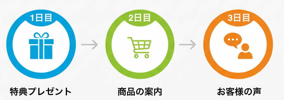 ステップ配信を使って、商品の魅力や利用後の変化(ビフォーアフター)、お客様の声を段階的に配信することで、「商品を買わない理由」を一つずつ潰していきます。これこそが、お客様が行動するまでの心理的なハードルを下げる、ステップ配信を行う最大の理由なのです。